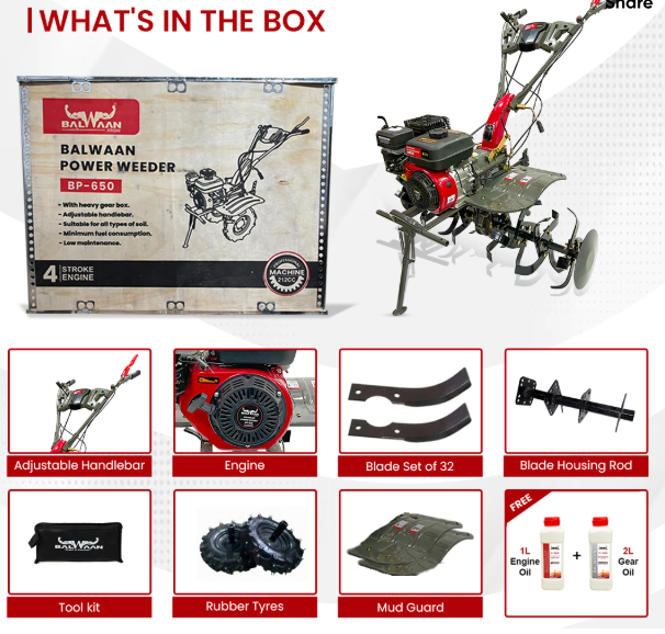 Introducing the Balwaan BP-650 (7HP 4 Stroke) Agricultural Power Weeder, a strong and efficient weeder machine designed for weeding and tilling, specially made for removing weeds from fruit gardens, vegetable fields, and floriculture areas. This 4-Stroke Power Weeder makes soil preparation easy with its strong 7HP engine and smooth performance. With a working width of 3 Feet and a depth is 7-9 inches, you can quickly till large areas of land, fields, arable plots, and plantations. It comes with 2 forward and 1 reverse gear, making it simple to control in all directions. The machine runs at 3600 RPM and has a 3.6L petrol tank for longer use without refueling. The Balwaan power weeder is farmer-friendly, fuel-efficient, and designed for comfort during long hours.