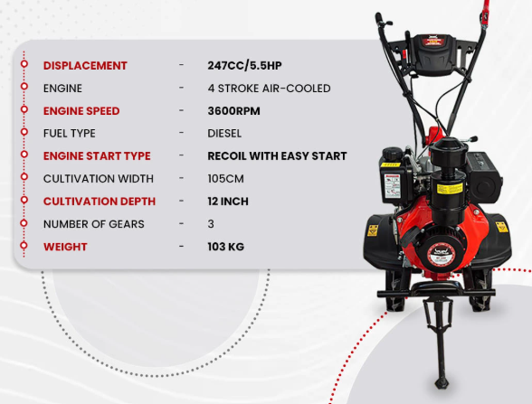 The Balwaan BP-850 Power Weeder is engineered to enhance your farming efficiency with its robust design and high-performance capabilities. It is powered by a 4-stroke air-cooled diesel Engine, offering a strong 247 CC displacement and 5.5 HP, making it ideal for a wide range of agricultural tasks. Equipped with 32 high-quality blades, this power tiller ensures thorough and consistent soil tilling, delivering exceptional results with each pass. With a cultivation width of 105 cm and the ability to till up to a 12-inch depth, it is perfectly suited for large-scale farming operations. The recoil starter system ensures reliable starts every time, while the 3600 RPM engine speed allows the machine to perform at its peak, even under tough conditions. Additionally, its fuel-efficient design consumes just 800ml of diesel per hour, with a 3.6-liter fuel tank capacity, ensuring longer operating periods between refills. Despite its powerful performance, the Balwaan Krishi BP-850E is easy to maneuver, weighing 103 kg, and is built for long-term durability. This power tiller is an excellent choice for farmers who need a reliable, heavy-duty machine that saves both time and fuel while significantly boosting productivity across large farms, orchards, or challenging terrains.